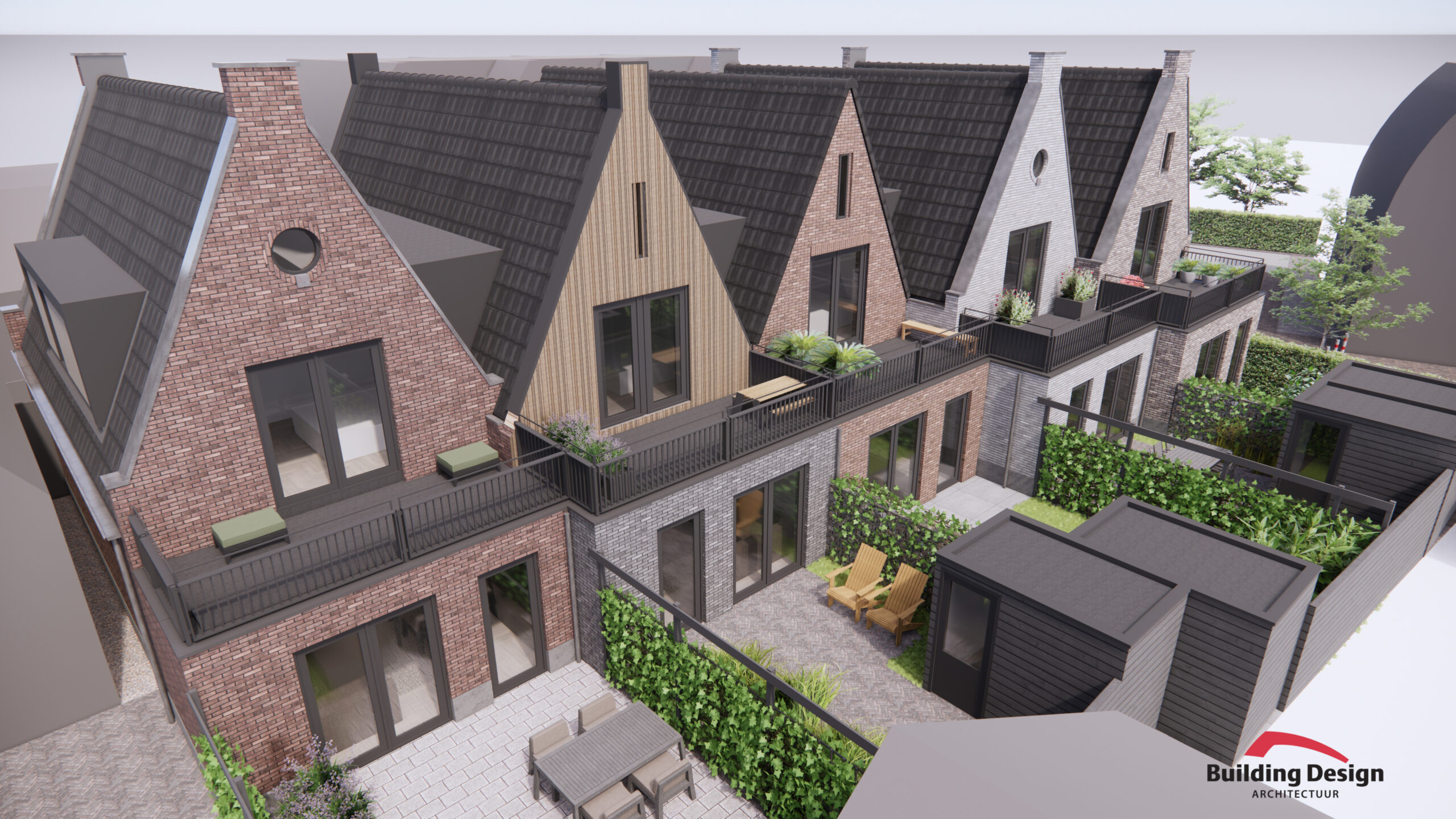 Elk van de 5 stadswoningen bestaat ui 2 etages en een vliering. De begane grond is voorzien van een uitbouw waarop een dakterras aan de master bedroom is gerealiseerd. Daarnaast beschikt elke woning over een tuin en een berging.